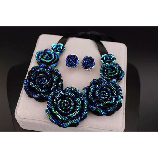 Nikko Blue Rose Statement Choker Necklace with Earrings