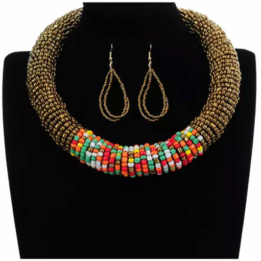 Coral Handmade Seed Beaded Necklace w/ Earrings